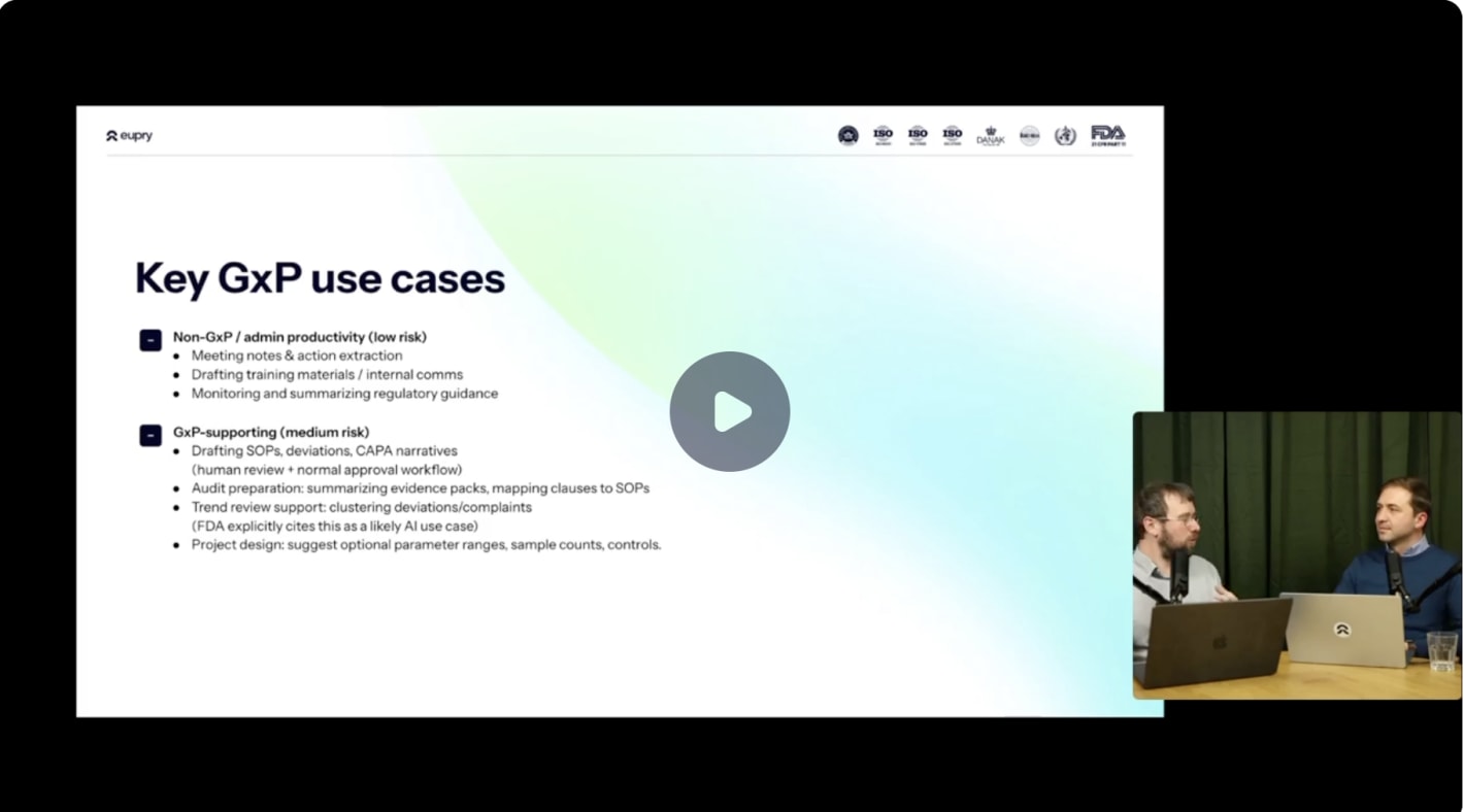 Want to dive deeper into practical AI implementation frameworks? Learn more about AI use in GxP in our on-demand webinar, covering these topics with specific industry examples.