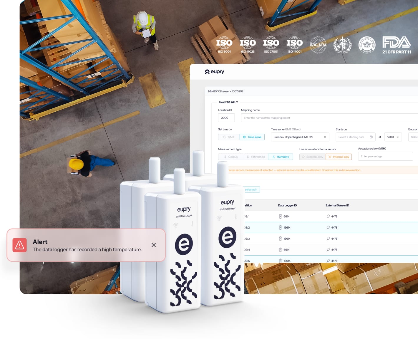 Eupry is more than mapping. We have created one solution for all your temperature compliance: From mapping to monitoring and calibration – all in one GxP-compliant platform, giving you a single source of truth and full control across all sites.