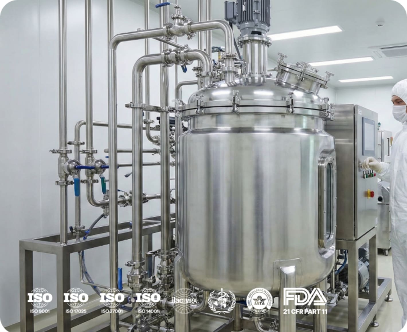 - Bioreactors and fermenters: Single-use and stainless steel systems from benchtop to production scale, with temperature mapping, steam penetration verification, and transfer line validation.