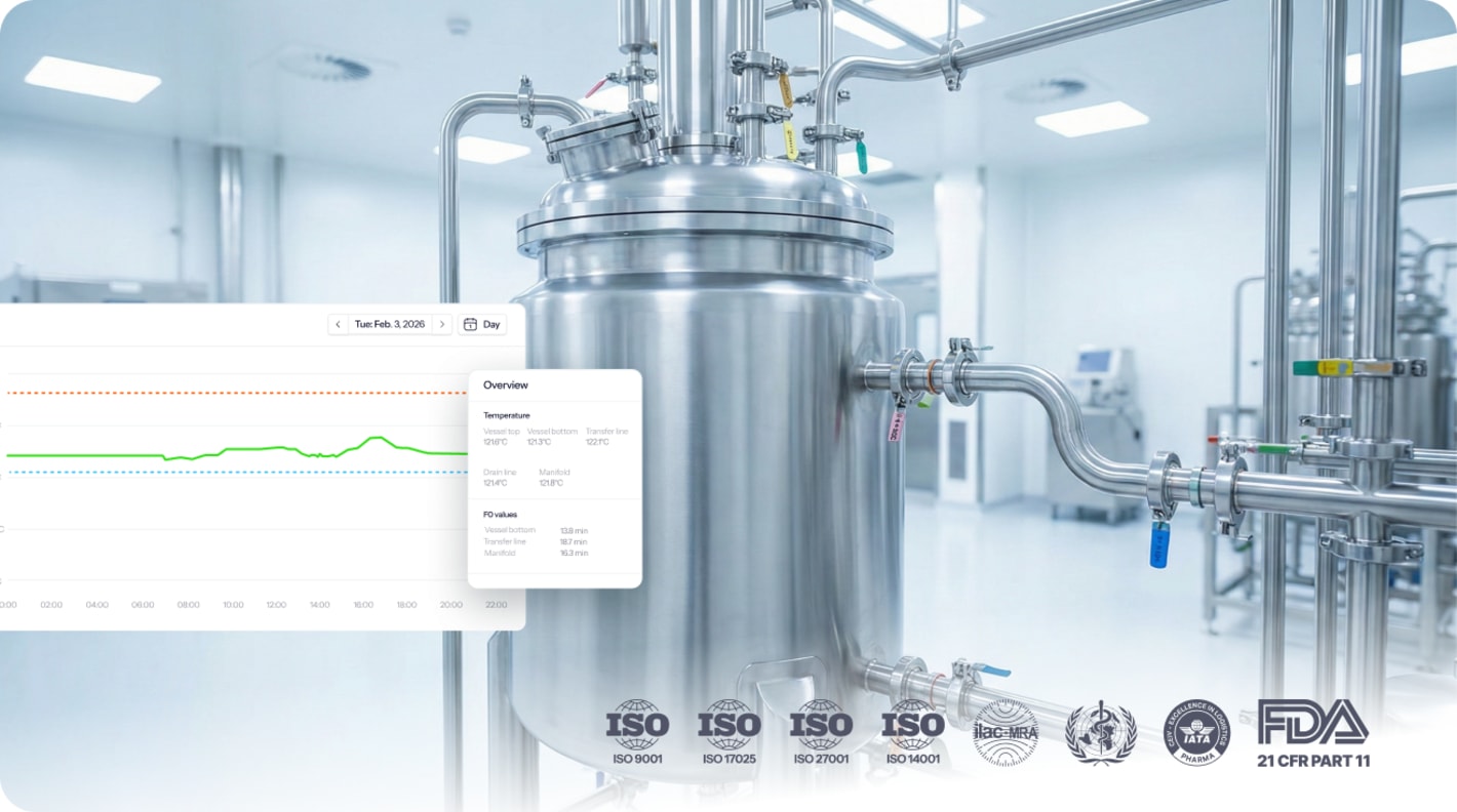 Every validation comes with ISO 17025 calibration with NIST traceability, ISO 17665 and EN 285 compliant protocols, 21 CFR Part 11-ready digital platform, and GMP Annex 15 aligned qualification approach.